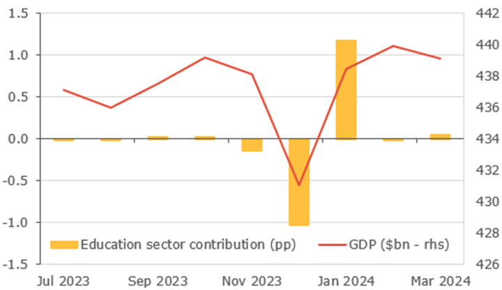 However, as soon as teachers returned to work in January, activity in the education sector jumped 23.6%, while the overall economy expanded 1.7% m-o-m. Interestingly, it took until March 2024 for the level of activity in the sector to return to the pre-strike level, suggesting some longer-lasting disruptions.